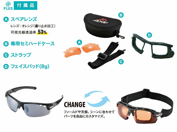 ■機能:UV400プロテクション、ポリカーボネイトレンズ(PC)曇り止め加工、硬質ナイロンフレーム、ノンスリップテンプル、フレキシブルノーズパッド、フェイスパッド(着脱可能)、D.P.Xシステム(Dobule Parts Crossing system)、72□16(8カーブ)、37g■サイズ:全幅145mm×高さ44mm■可視光線透過率:BK(ブラック):12%スペアレンズ(オレンジ曇り止め加工):53%※当店では、システムで在庫調整を行っております。
