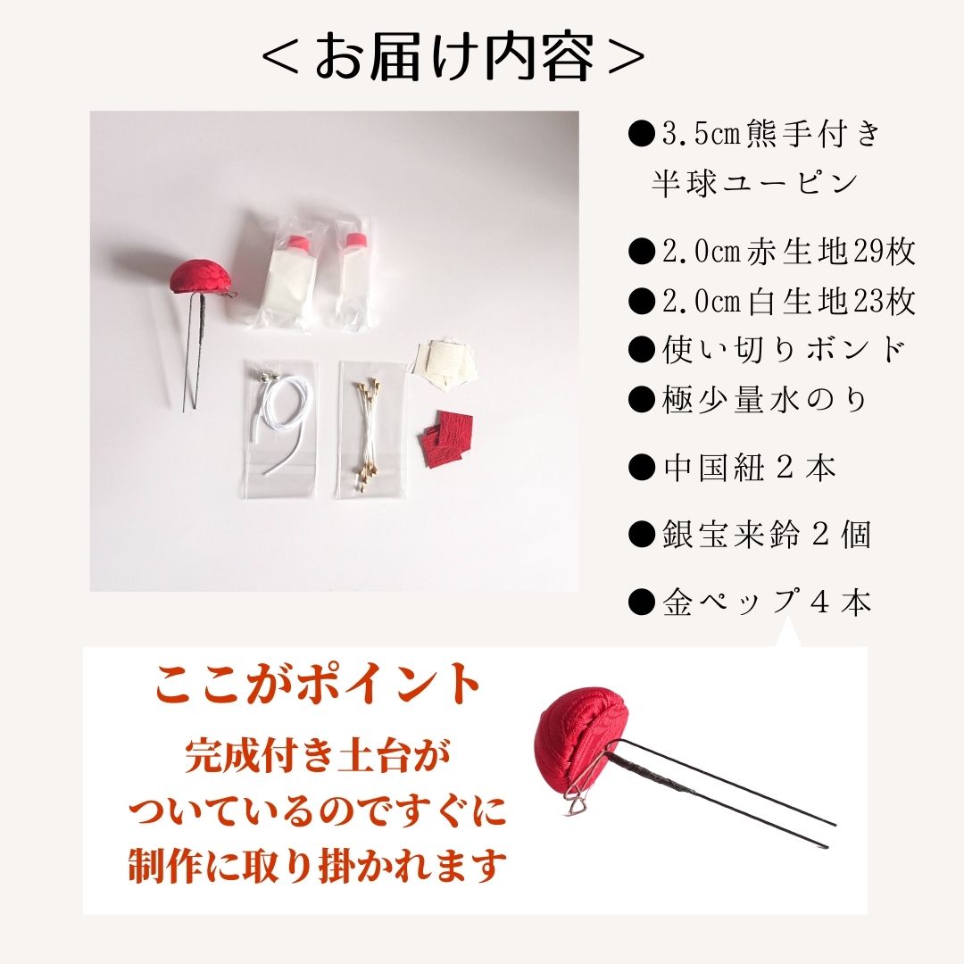 商品情報 キット内容 「半球台3.5cm(3.5cm球を使用)7cm下がり用熊手付きユーピンセッティング済み」= 1本「2.0cm角の生地」= 52枚「金ペップ8粒(4本)」下がり用・中国紐2本宝来鈴2個 商品詳細)生地編 2.0cm角の縮緬正絹(絹 シルク)生地が赤40枚白12枚正絹縮緬の生地をご用意いたします。